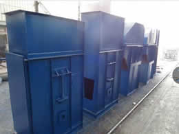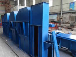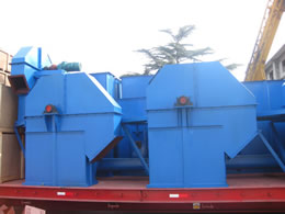 料斗把物料從下面的儲藏中舀起,隨著輸送帶或鏈提升到頂部,繞過頂輪后向下翻轉, 斗式提升機將物料傾入接受槽內。帶傳動的斗式提升機的傳動帶一般采用橡膠帶,裝在下或上面的傳動滾筒和上下面的改向滾筒上。鏈傳動的斗式提升機一般裝有兩條平行的傳動鏈,上或下面有一對傳動鏈輪,下或上面是一對改向鏈輪。斗式提升機一般都裝有機殼,以防止斗式提升機中粉塵飛揚。