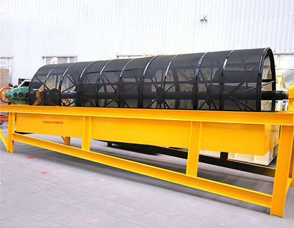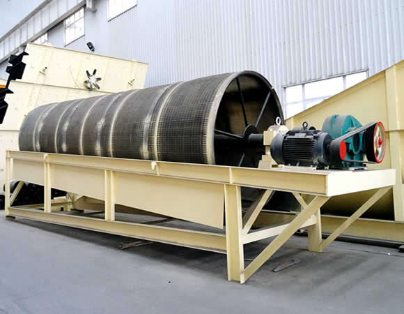 電機驅動滾筒軸線作旋轉運動,減速機調節筒體以一定的轉速旋轉,物料由進料口進入筒體內,在旋轉產生的離心力作用下,物料在筒內翻滾,自上而下通過分級篩網析出,由于篩網分級尺寸不同,物料逐漸被分離篩選,粒度合格的物料經篩分后落入到各自的漏斗,然后由人力方式運出或通過輸送機自流送往成品站。合格產品經過下端出料口排出,顆粒較大,分選不合格的產品經另一排料口排出,筒內清理裝置,使篩網不宜被阻塞。