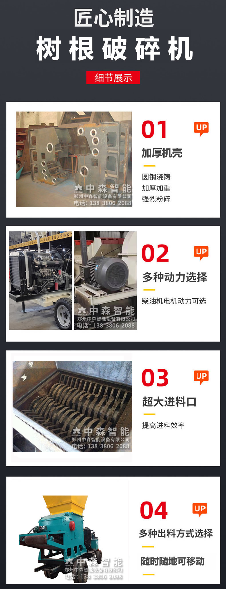 【產品名稱】樹根破碎機(樹疙瘩破碎機、移動式樹根破碎機)可加裝輪子移動,使用更方便,上客戶可通過喂料設備或鏟車直接將樹根等大型木料進行直接破碎切片。如果使用現場沒有配套電力,我公司可為客戶配備相應的柴油機代替電動機動力,解決了山區、林場的無動力問題
