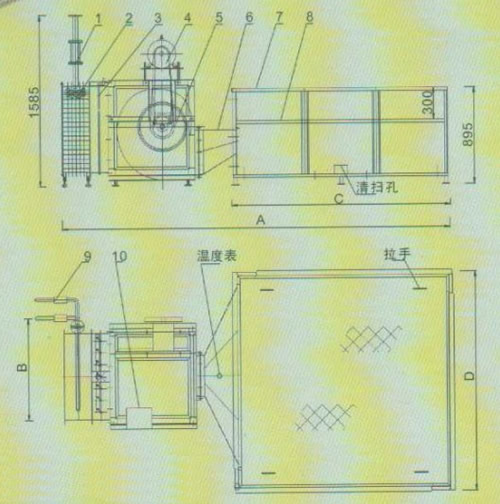 型號 風量(m3/h) 功率(Kw) 蒸汽耗量(kg/h) 散熱器面積(m2) 干燥能力(KgH2O/h) 外形尺寸(長寬高)MM